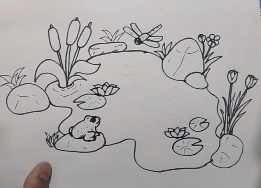 This image illustrates a tutorial on how to draw a tranquil pond scene, featuring water lilies, flowers, a frog, and a dragonfly, designed for beginner artists to learn step-by-step.