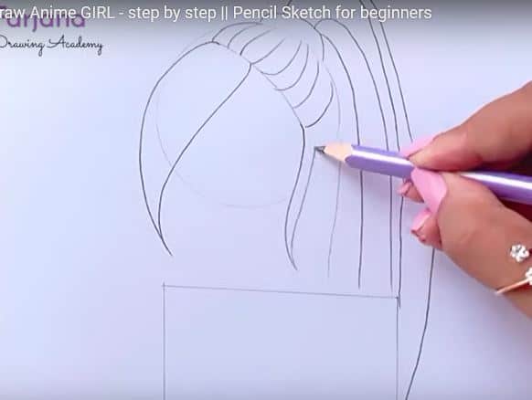 This image shows a person sketching the outline of an anime girl on paper, focusing on drawing hair and head shape with a pencil. It’s part of a step-by-step drawing tutorial designed for beginners to improve their anime drawing skills.