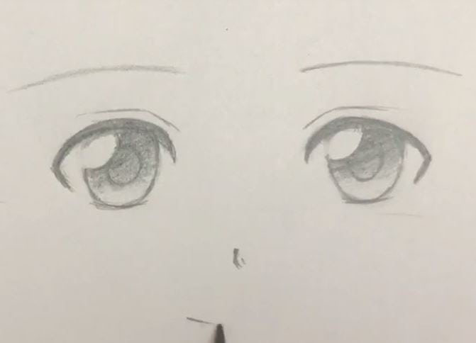 This image shows the initial sketch of anime-style eyes, including outlines and shading techniques, ideal for artists learning how to draw manga characters from scratch.