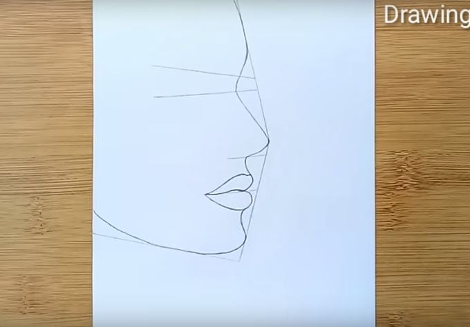 This image shows the initial pencil sketch outline of a woman’s face in profile, highlighting the stages of drawing facial features like lips, nose, and chin using simple lines for beginners learning how to draw step by step.