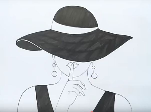 An illustrated guide showing how to draw a fashionable woman with a wide-brim hat and earrings, making a shushing gesture. This step-by-step drawing tutorial is ideal for artists learning fashion and accessory sketching.
