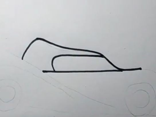 This image shows the initial sketch process of drawing a car, highlighting the basic framework with simple lines and shapes to guide further detailing and coloring.
