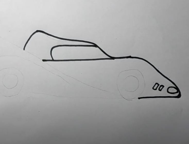 This image shows the initial sketching stage of drawing a car, emphasizing step-by-step techniques for creating vehicle illustrations, ideal for aspiring artists and learners.