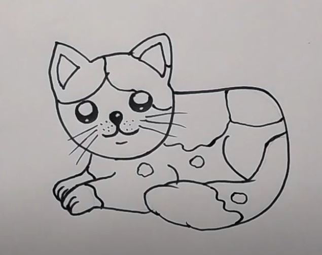 This black-and-white line art depicts a adorable curled-up cat with big eyes, whiskers, and a cute facial expression. It is designed as a beginner-friendly tutorial image for step-by-step drawing guides, focusing on easy techniques to learn how to draw cats.