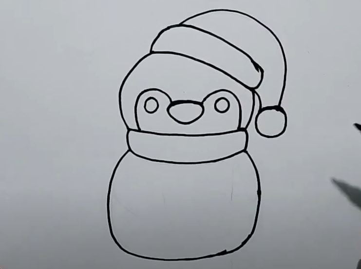 This image shows the initial sketch of a cute penguin in a simple line drawing, complete with a Santa hat and scarf. It’s part of a tutorial on how to draw step-by-step, helping artists of all ages learn to create festive animal illustrations easily and enjoyably.