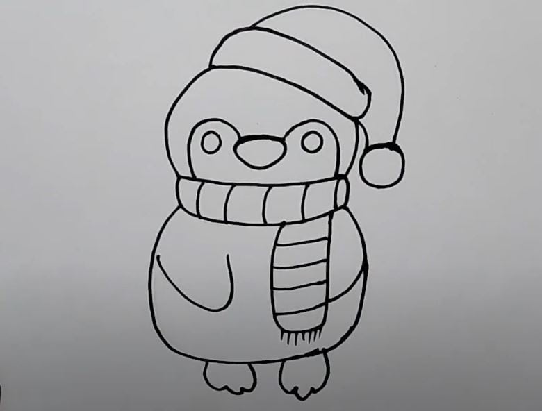 A charming illustration of a penguin in winter attire, demonstrating easy drawing steps for creating festive holiday penguin art. Perfect for holiday craft projects and beginner artists.