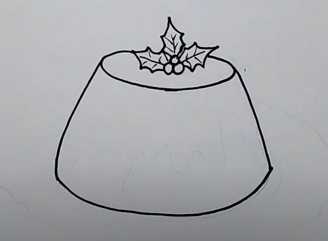 This image illustrates the initial stages of drawing a traditional Christmas pudding with a holly garnish on top, using simple black lines. It’s part of a step-by-step guide on how to draw holiday-themed desserts, perfect for artists learning to create festive illustrations. The drawing emphasizes basic shapes and easy techniques for beginners to follow.