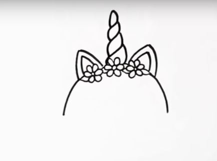 This image shows the initial sketch of a unicorn’s head, featuring the outline of its horn, ears, and floral decoration, part of a step-by-step drawing tutorial for beginners looking to learn how to draw unicorns.