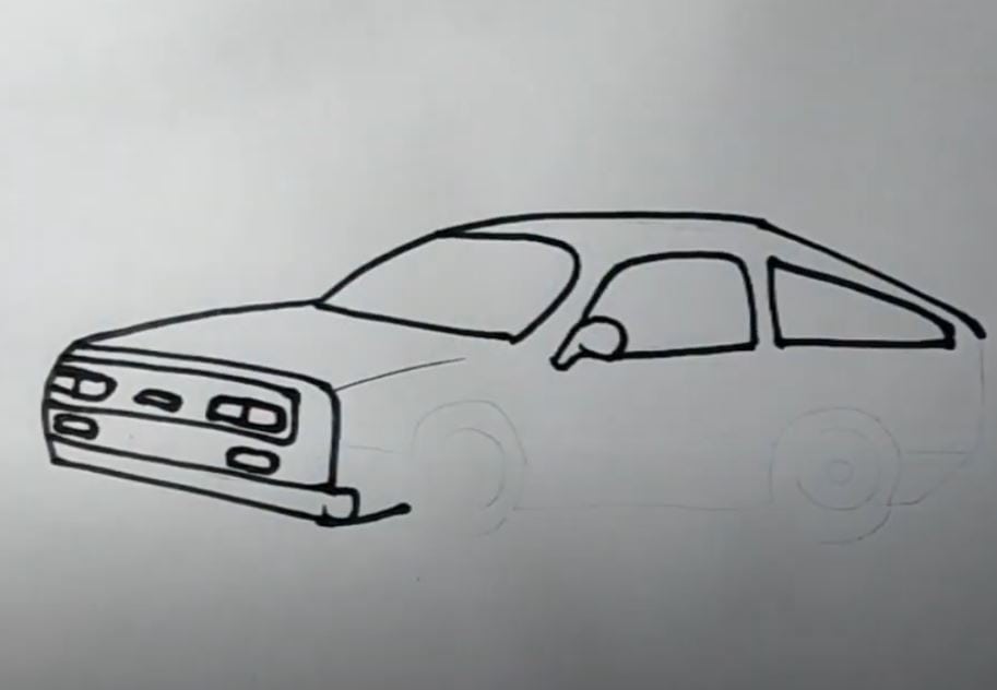 This image demonstrates the initial step in drawing a car, highlighting the process of outlining the vehicle’s shape and details for realistic car illustrations. It’s ideal for art students and enthusiasts learning vehicle drawing techniques.
