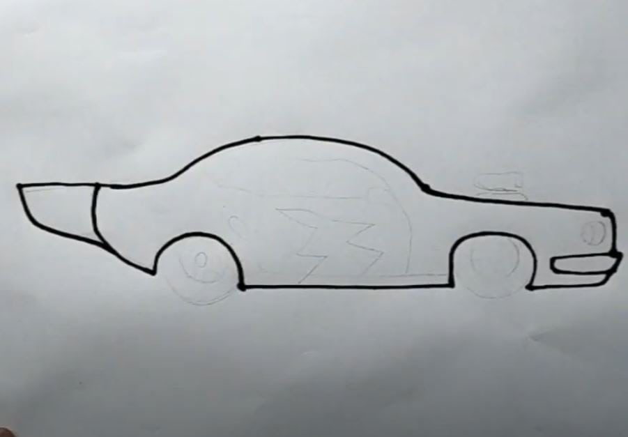 This image shows the initial sketch of a car, highlighting key outlines like the body, wheels, and windows, used in creating detailed car drawings through a step-by-step process.