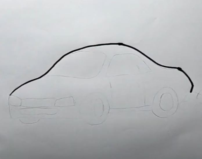 This image shows the initial outline of a car with basic features such as the body, windows, and wheels, illustrating the first stages in a car drawing tutorial for beginners.