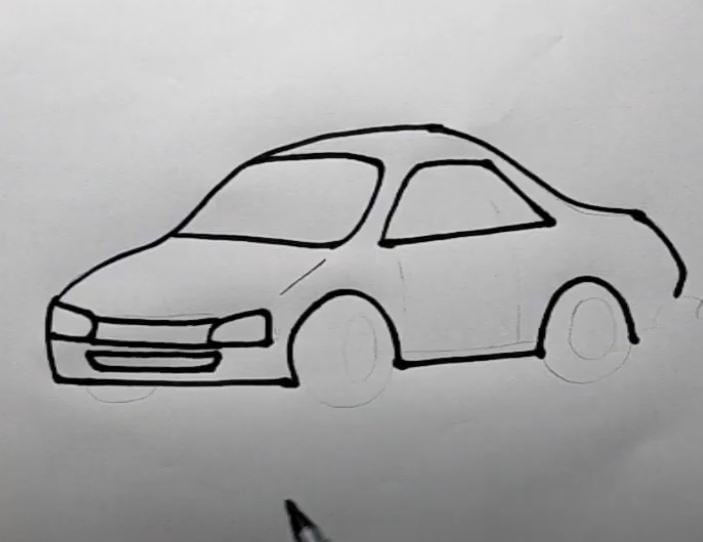 A simple black-and-white illustration showing the initial outline of a car, demonstrating the basic lines and shapes used in step-by-step car drawing tutorials.