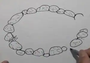 Draw some water hyacinths growing around the pond! First, create the flower head by drawing an elongated shape. Then, draw the stem by drawing two straight lines connecting to the bottom of the flower head.