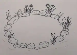 Complete the pond drawing by first coloring the grass with a green colored pencil. Next, color the rocks with a gray colored pencil. Now, shade the flower head of the Bodhi tree with an orange colored pencil and the trunk with a brown colored pencil. Then, color the duck with a yellow colored pencil. Use an orange colored pencil to shade the duck’s beak. Finally, use a blue colored pencil to color the water.