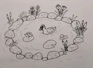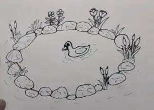 Add a duck swimming in the pond by starting with its beak, outlining its body, then adding its eyes by drawing a circle with shading. Next, draw a smaller circle on the beak to represent the duck’s nostrils, and add wings with oval shapes with slightly pointed tips as illustrated.