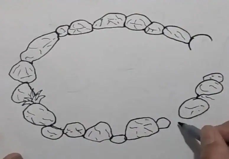 This image showcases the initial sketching phase of drawing a stone circle, with an emphasis on shaping irregular stones arranged in a circular pattern. It is ideal for art learners seeking guidance on drawing natural-looking stones and practicing basic sketching techniques.