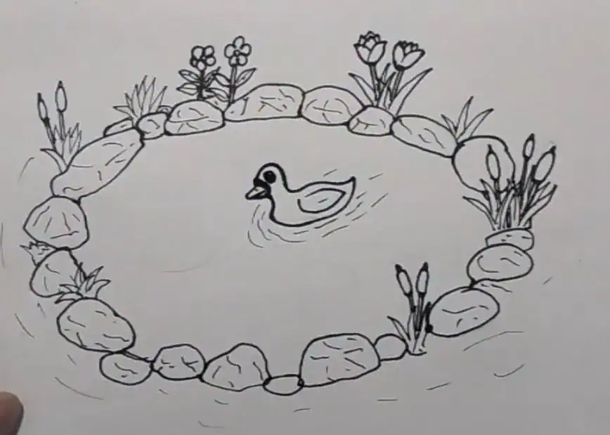 Step-by-step instructions for drawing a tranquil pond with a duck, rocks, and blooming flowers, perfect for beginners seeking easy art tutorials on nature scenes and drawing water bodies.