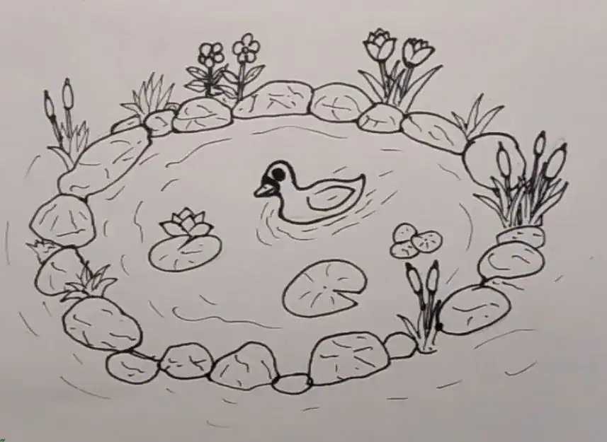 A simple guide to drawing a tranquil pond with lily pads, duck, rocks, and aquatic plants for artistic practice.