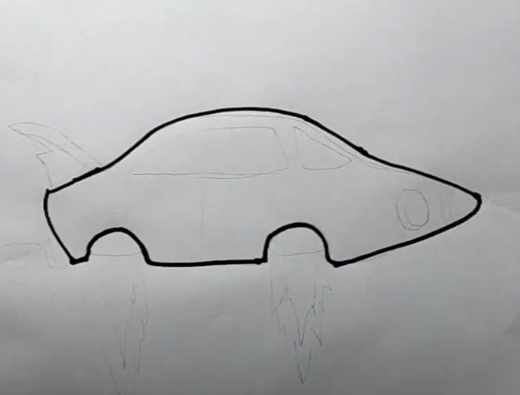 An illustrated tutorial showing the initial sketching process of drawing a car, focusing on creating a clear car outline with step-by-step instructions.
