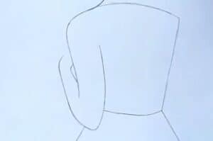We will draw a girl wearing a short dress, with her back to you, holding a beautiful bouquet of flowers. Therefore, first, we sketch the girl’s back with an inverted trapezoid shape because the girl has a small waist 🙂 as illustrated.
