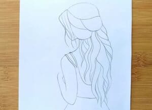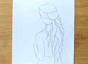 Next, sketch the girl’s neck and head with long, flowing hair in a soft, loose curl style. Add details like hair covering the girl’s beautiful face (even though it’s not visible, I believe her face is very pretty 🙂 )