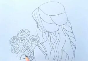 We will draw the girl’s left hand in the pose of holding the fresh flowers. Note that the girl’s hand should be drawn appropriately, not too thick 🙂