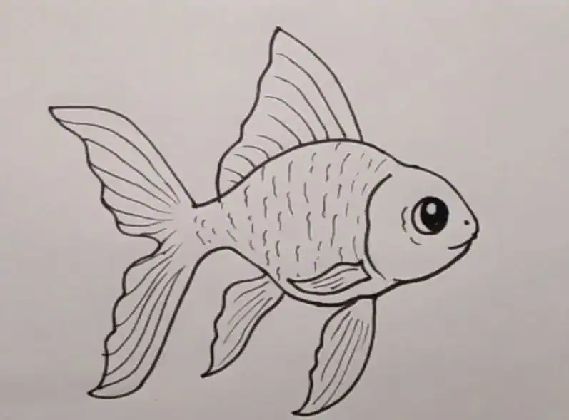 This image shows a simple, step-by-step illustration of a fish, demonstrating how to draw fish with detailed fins, body, and expressive eye for artistic beginners and hobbyists.