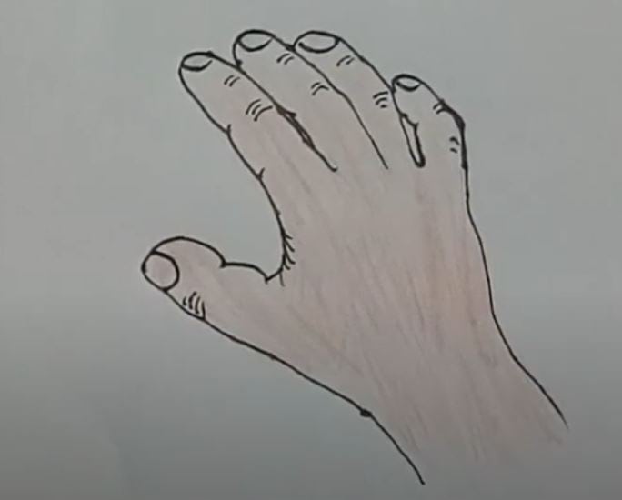 This image shows a simple line drawing of a hand with clear outlines and minimal shading, perfect for learning how to draw a hand step by step.
