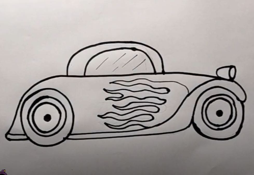 This image showcases a beginner-friendly step-by-step guide for drawing a vintage race car with flames, emphasizing the importance of outlines and basic shapes for creating detailed car artwork.