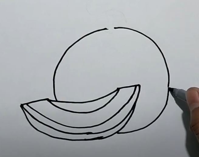 This image shows the process of sketching a watermelon on paper, starting with basic outlines and curved lines to create a realistic fruit drawing tutorial.