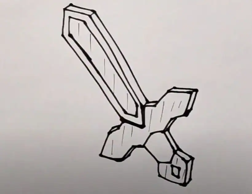 This image demonstrates the initial sketching process of drawing a sword, highlighting the basic geometric shapes and guidelines. Ideal for art students and beginners learning how to draw weapons, offering a clear, step-by-step visual guide from start to finish. Relevance to “how to draw step by step.”.