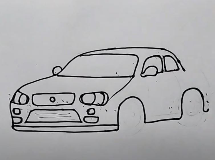 This image shows a basic outline of a car being drawn with simple lines, illustrating the early stages of a detailed car sketch, ideal for learning how to draw vehicles from scratch.