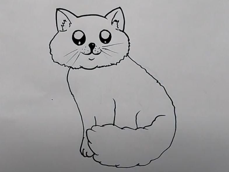 This image shows a basic line drawing of a cute cat with large, expressive eyes, a smiling face, pointed ears, and a fluffy tail, demonstrating the initial stages of step-by-step cartoon cat drawing.