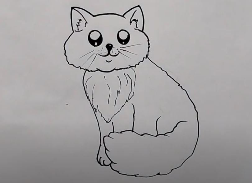 This image provides a step-by-step guide to drawing a cute cartoon cat, including the basic outlines and facial features, ideal for artists, kids, and beginners interested in learning how to draw animals in a fun and easy way.