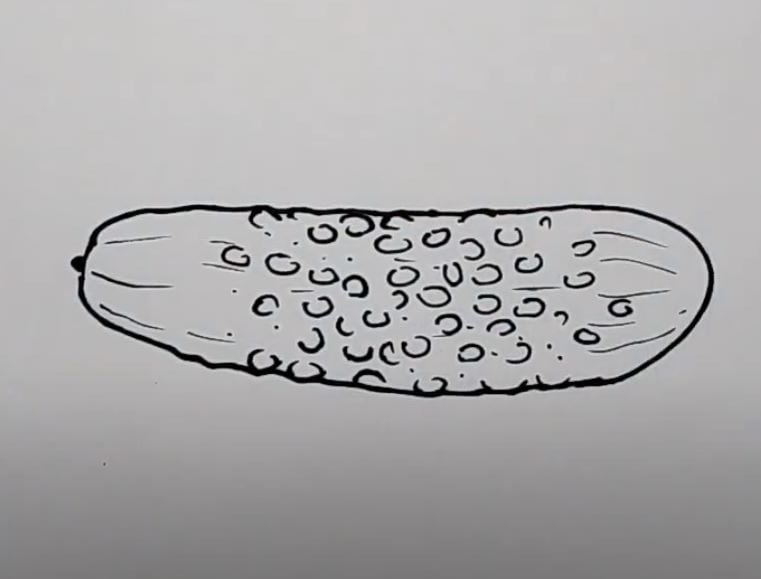 This image shows a basic black-and-white line illustration of a pickle, demonstrating the drawing process step by step. It includes outlines and small details like seeds or bumps, making it useful for learning how to draw vegetables in a straightforward and accessible way.