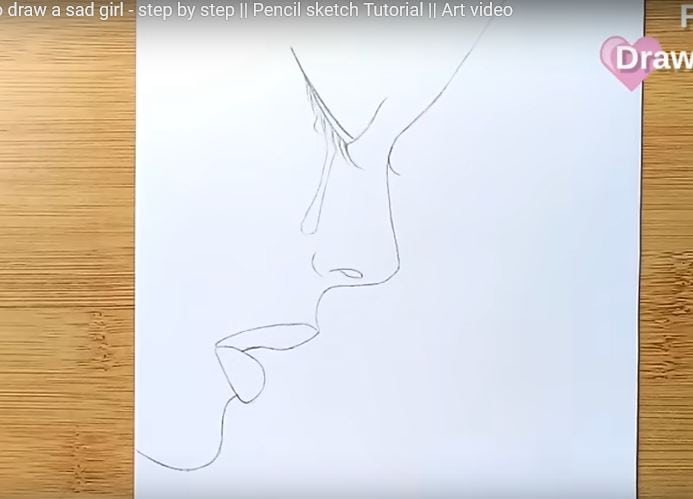 This image shows the initial outline sketch of a sad girl’s face using light pencil lines, demonstrating the process of creating facial expressions and proportions for realistic art drawings.
