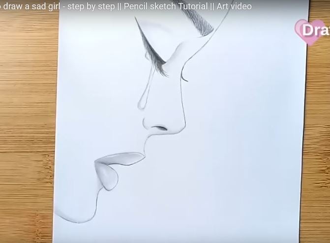 This image shows the process of creating a realistic pencil sketch of a sad girl, focusing on features like eyes, nose, and mouth with soft shading techniques, ideal for art students and beginners interested in drawing emotional portraits. Relevance: high.