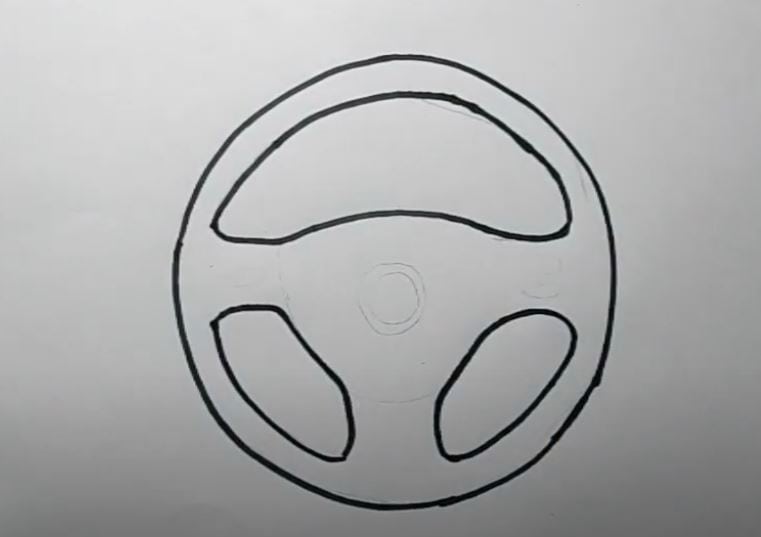 This image features the initial sketch of a steering wheel outline, illustrating the basic shapes and structure for beginners to follow in a drawing tutorial.