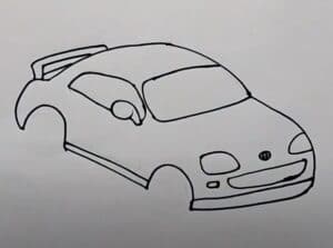 Create the outline of the body of the Toyota Supra. Then, draw a straight line between the two fenders to add the side bumper. Attach the thin spoiler above the rear of the car.