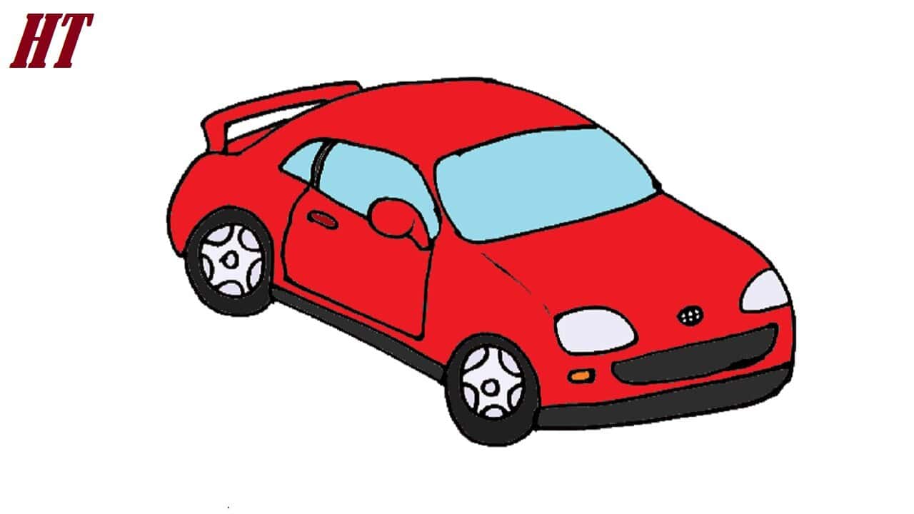 This image shows a simple, colorful cartoon red sports car illustration suitable for drawing tutorials and step-by-step art guides.