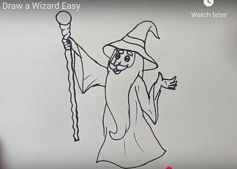 This detailed image shows a step-by-step drawing process of a cheerful wizard with a staff, hat, and flowing robes, ideal for art students and beginners wanting to learn how to draw magical characters easily.