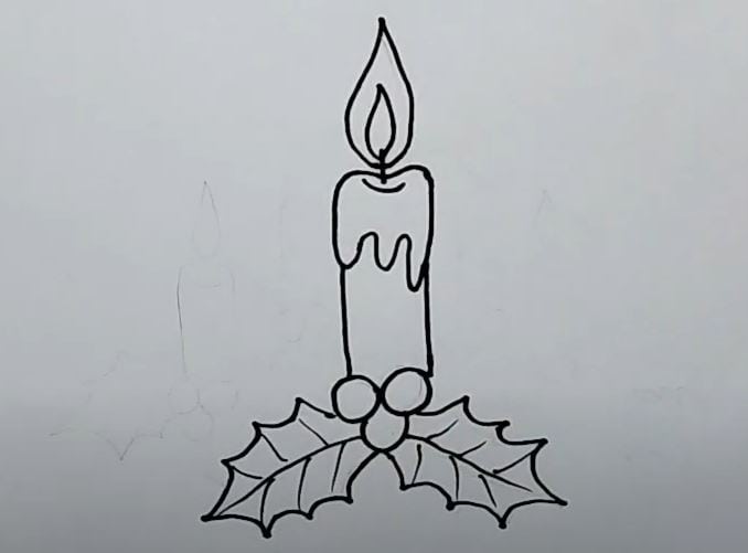 A clear, black-and-white line art showing how to draw a candle with holly leaves and berries, perfect for step-by-step drawing guides and tutorials. Relevance: high, matching the “how to draw step by step” theme.