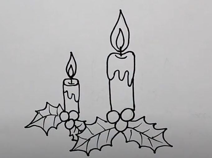 This image shows a line drawing of two candles with flames, surrounded by holly leaves and berries, perfect as a guide for learning how to draw holiday-themed candles and decorative elements.