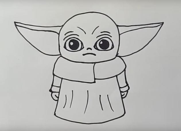 This image provides a clear, instructional illustration of how to draw Baby Yoda (Grogu) from the Star Wars universe, emphasizing steps for beginners interested in cartoon or fantasy character drawing tutorials.