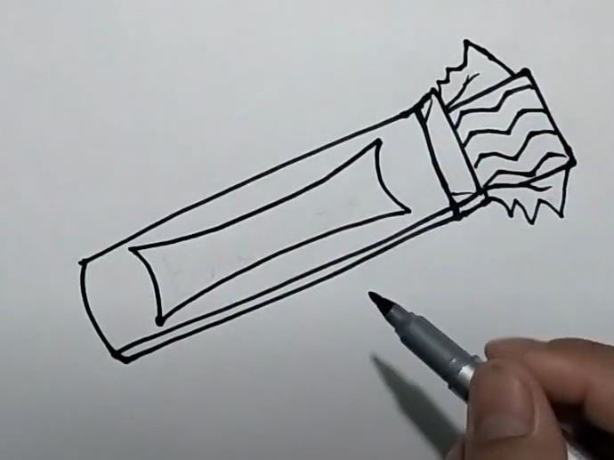 This image showcases a hand drawing a crayon with a black ink pen on white paper, illustrating the initial sketching process for learning to draw step by step.