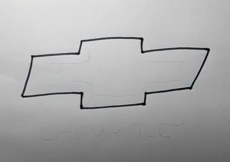 This image shows a hand-drawn outline of the Chevrolet logo on paper, illustrating the step-by-step process to sketch the iconic bowtie emblem. It includes initial sketches and guidelines for accurate logo drawing.