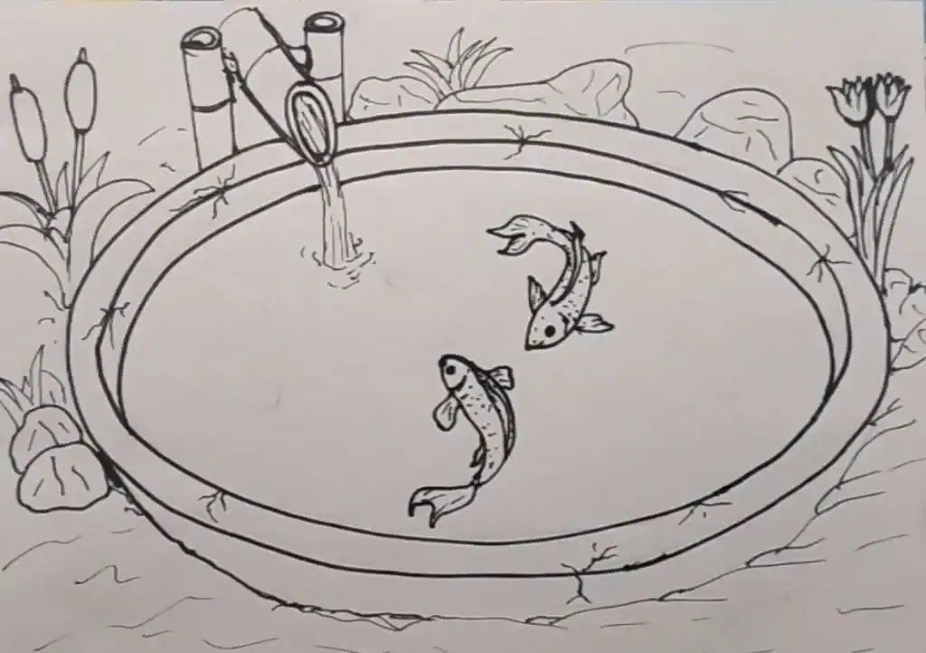 Koi fish drawing tutorial with step-by-step instructions, featuring a pond scene with fish, plants, and stones for beginners learning how to draw aquatic life and garden landscapes.