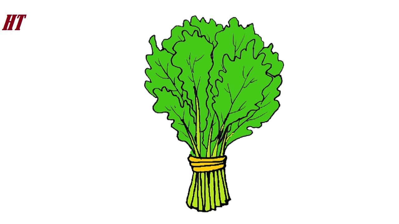 This image showcases a simple, colorful illustration of a bunch of green leafy vegetables, with clear outlines and shading, ideal for art students or drawing enthusiasts learning how to sketch vegetables step by step. It highlights the process of drawing food items with attention to detail and color.