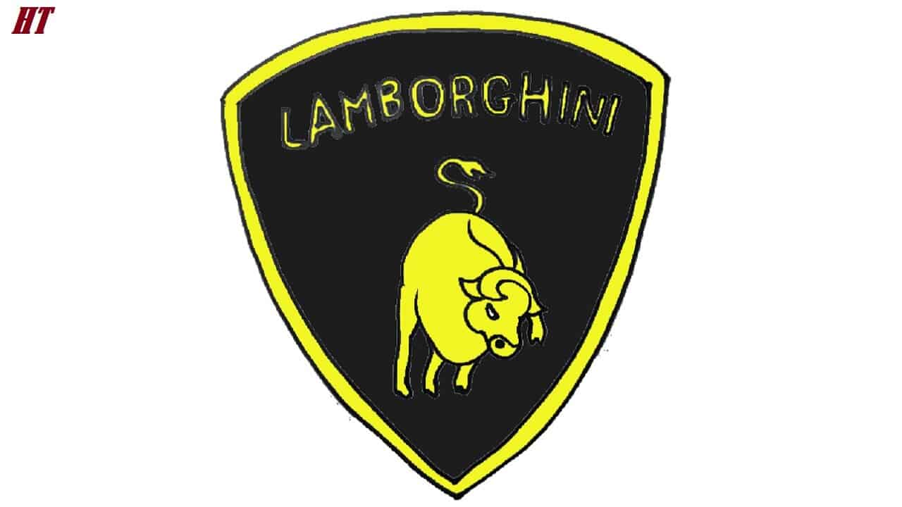 Lamborghini logo illustration with a yellow bull on a black shield background, showing step-by-step drawing instructions for creating a Lamborghini emblem.
