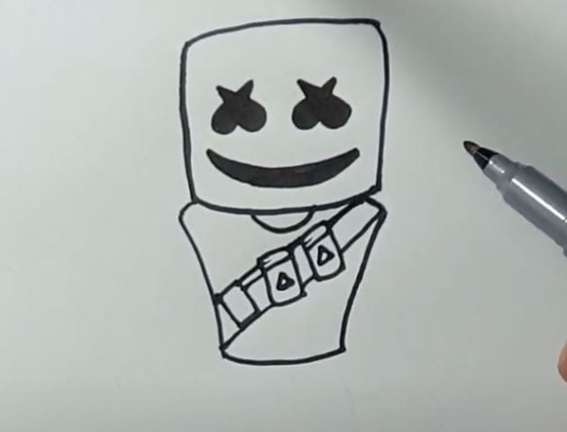 This image shows the step-by-step process of sketching Marshmello, the popular DJ and music producer, using basic line art techniques for artists and fans.